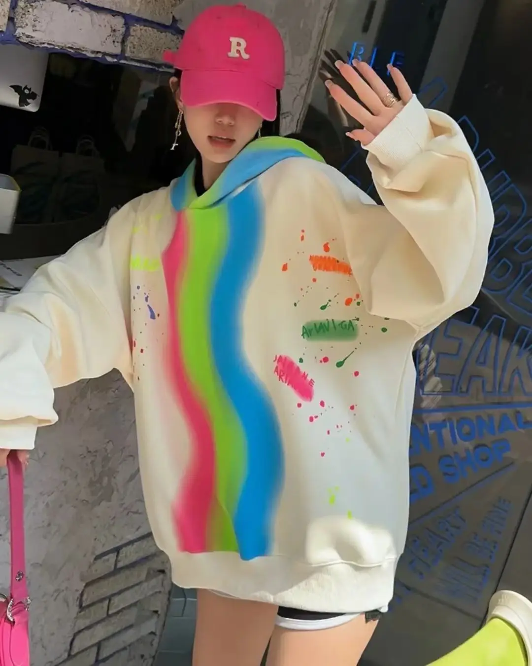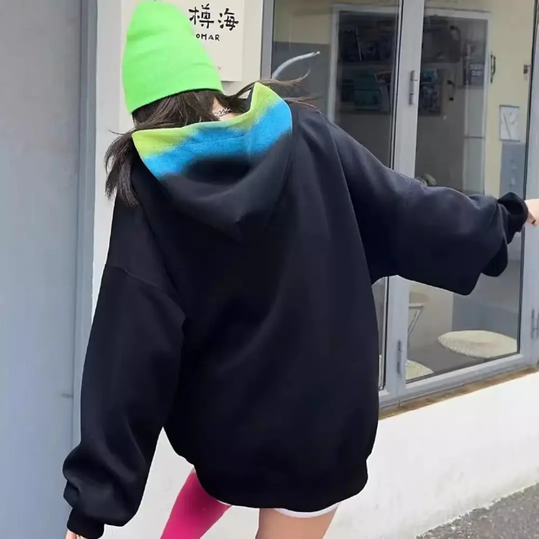 Hot Trendy Women's Winter Knit Hoodie with Long Length Hand-Painted Rainbow Pattern Street Style Jumper Cuff Ribbed Jumper